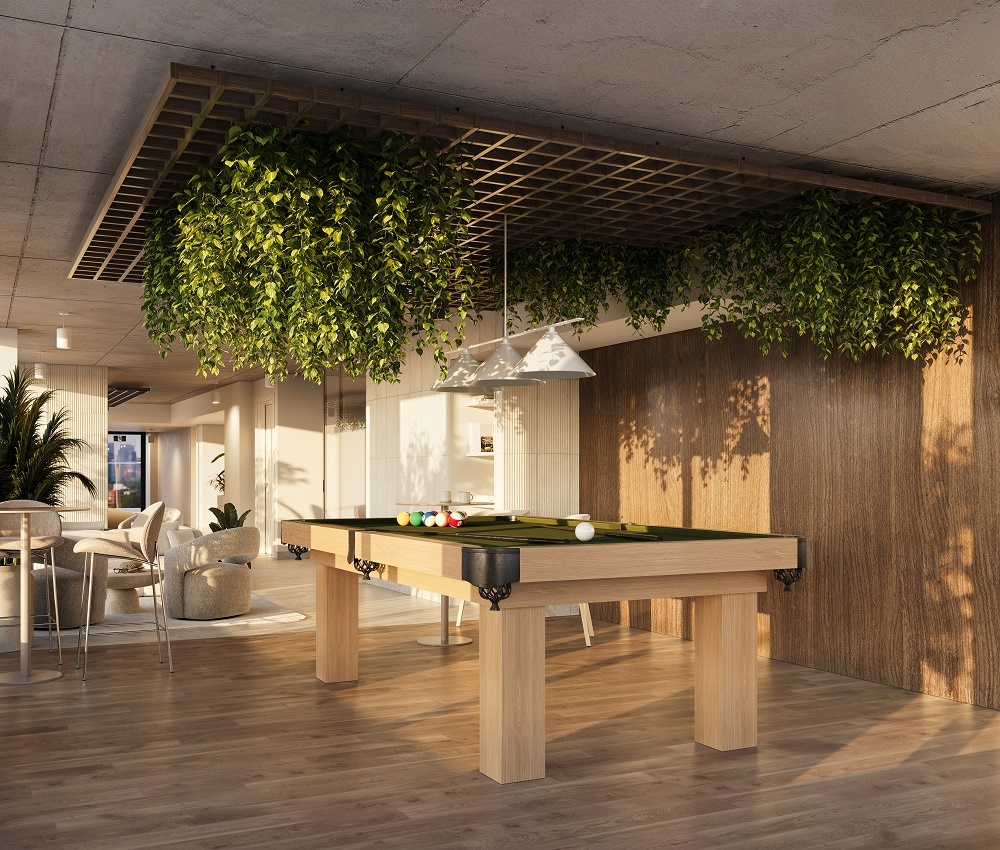 Développé par PUR Immobilia, Bosco est un ensemble locatif de 230 unités pensé dès l’origine comme un milieu habité, vivant, traversé par des usages multiples. Pour Sophie Plante, designer conceptrice chez PUR, la question n’a jamais été de multiplier les commodités, mais de créer des lieux où l’on a envie de s’arrêter. Les halls, corridors, salons communs et espaces de coworking ne sont pas conçus comme des zones neutres de transition, mais comme des espaces à part entière, capables d’accueillir, d’apaiser, de soutenir les rythmes du quotidien.